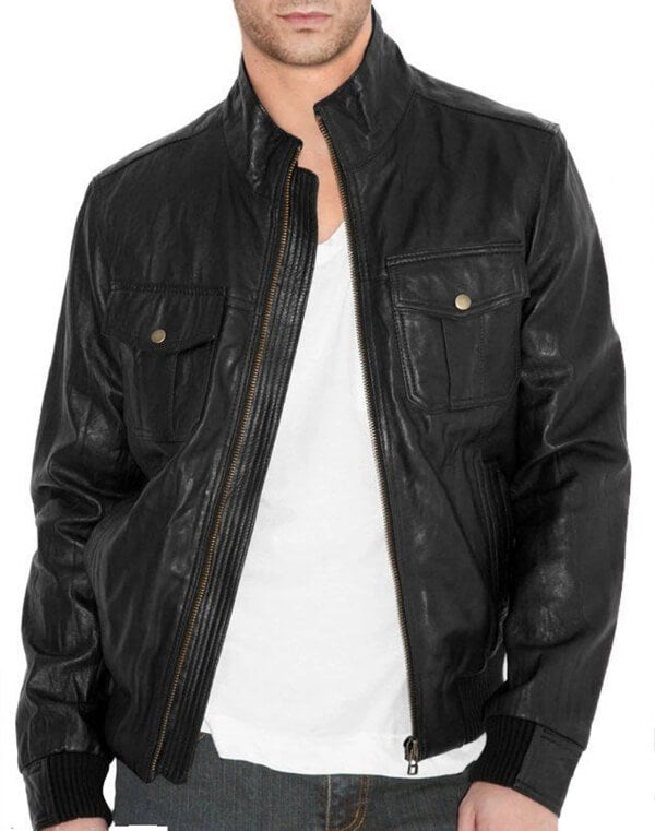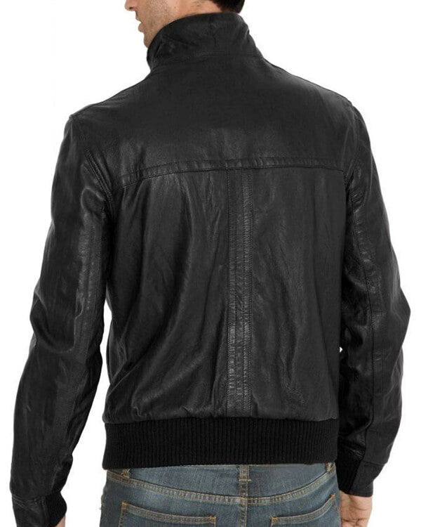 Fitted Bomber Style Black Leather Jacket for Men